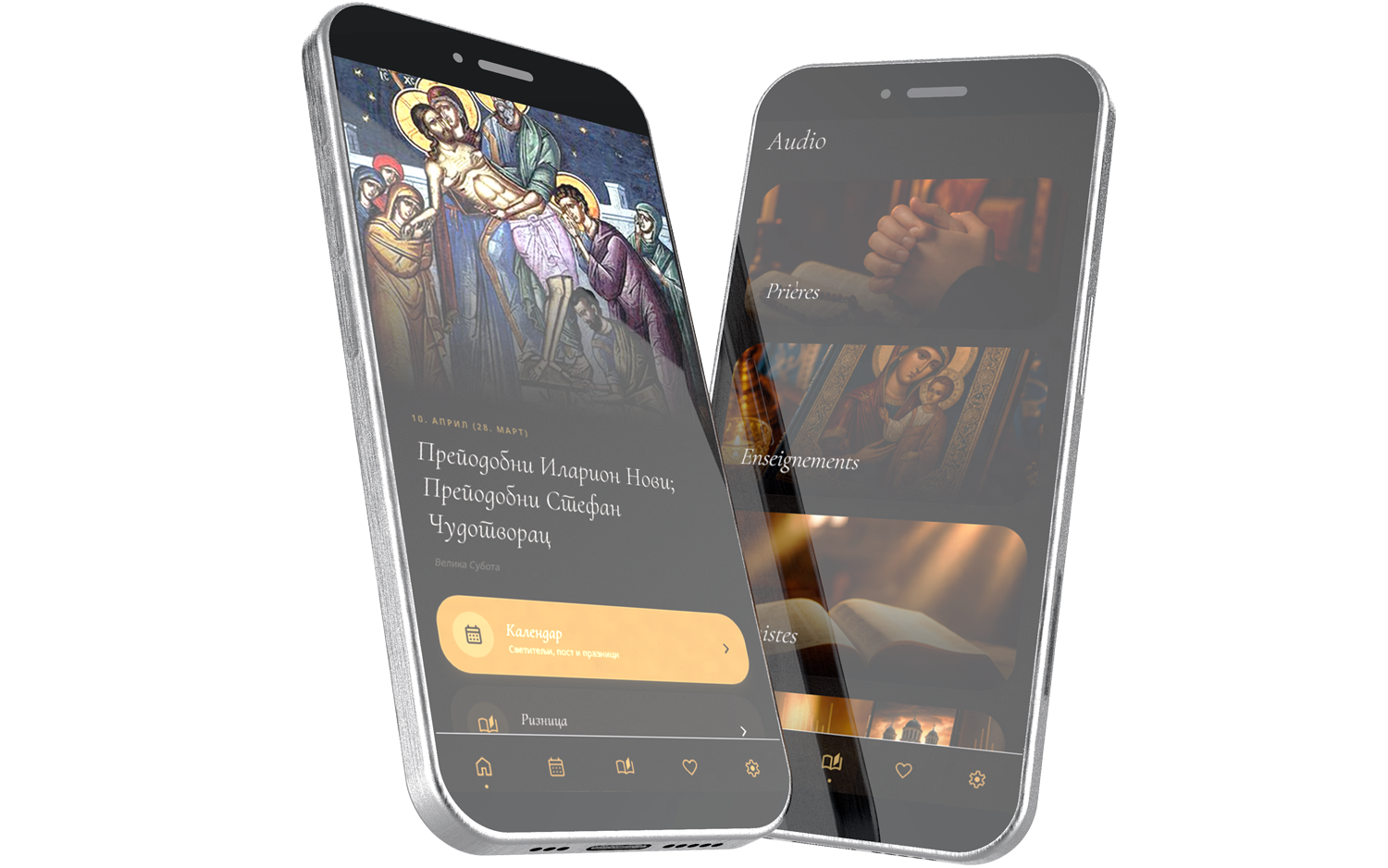 Cyrillique serbe et français — chaque texte, saint, interface. Basculement instantané mémorisé entre les sessions.